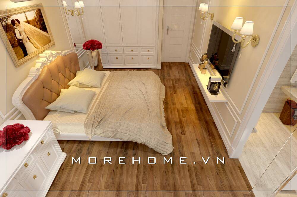 Giường ngủ chung cư được làm từ chất liệu gỗ tự nhiên phun sơn trắng, luôn mang đến vẻ đẹp tinh khiết và hài hòa cho không gian phòng ngủ sang trọng, tiện nghi