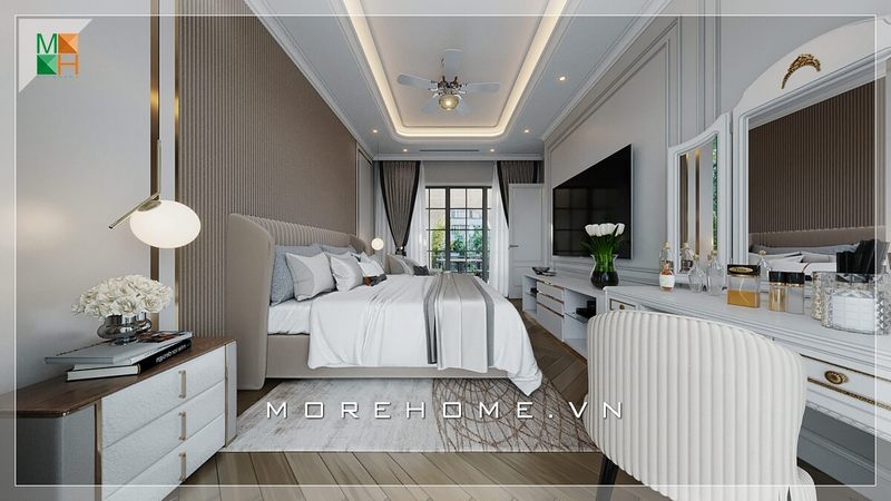 Mẫu giường ngủ hiện đại sắc trắng làm tăng độ tinh tế và tiện nghi cho không gian phòng ngủ nơi đây.