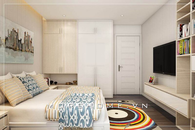 Thiết kế nội thất phòng ngủ chung cư hiện đại, KTS lựa chọn gam màu trung tính nhẹ nhàng giúp cho chủ nhân căn phòng cảm giác thoải mái và dễ chịu hơn